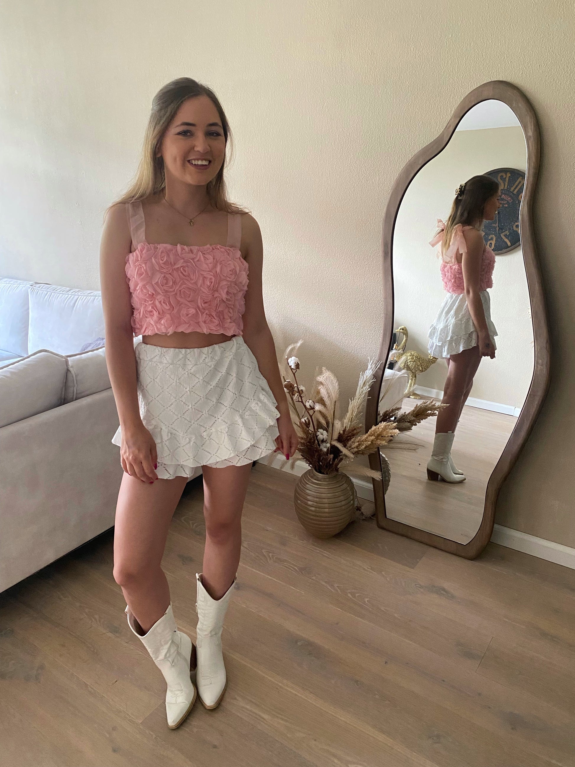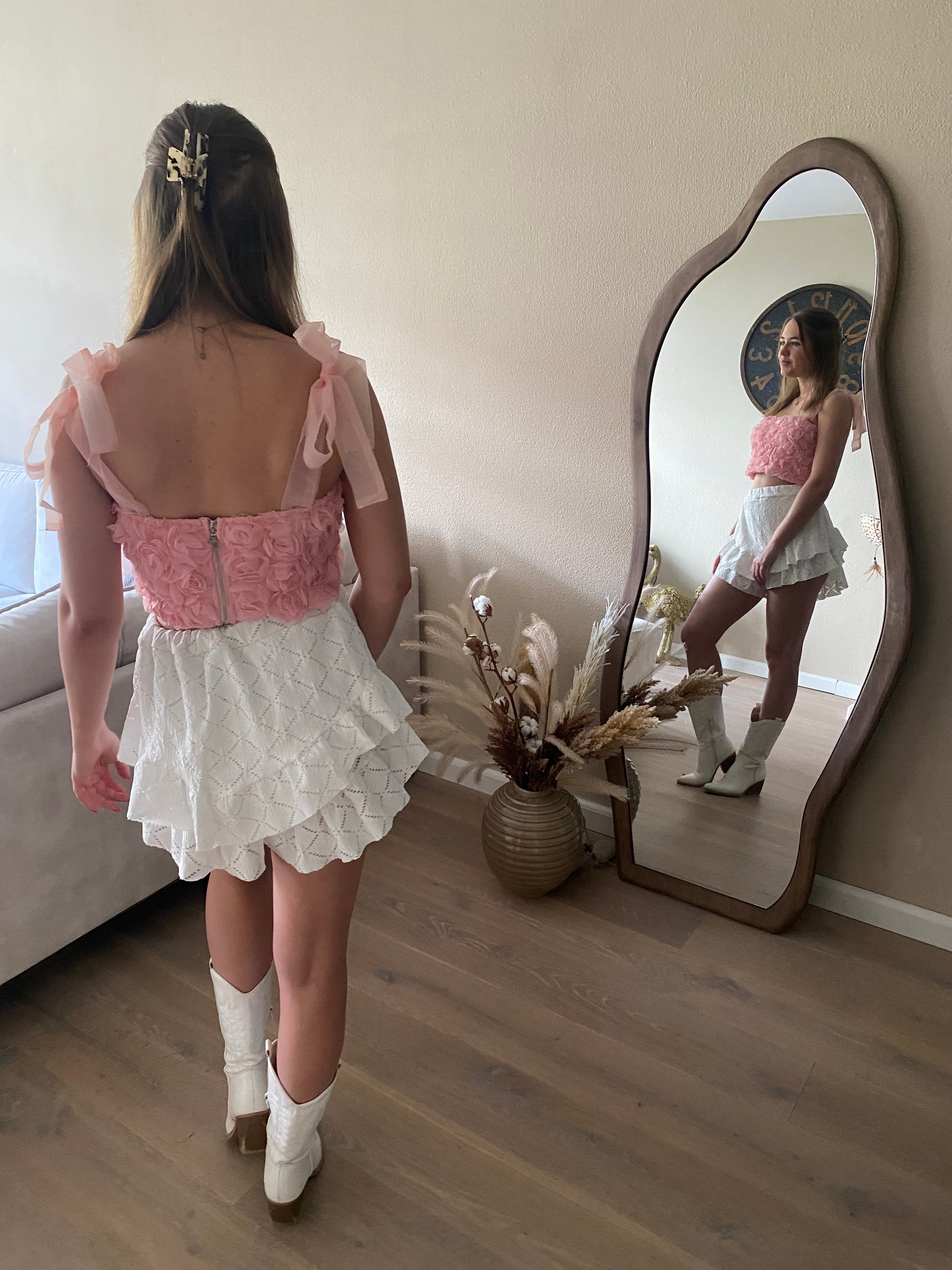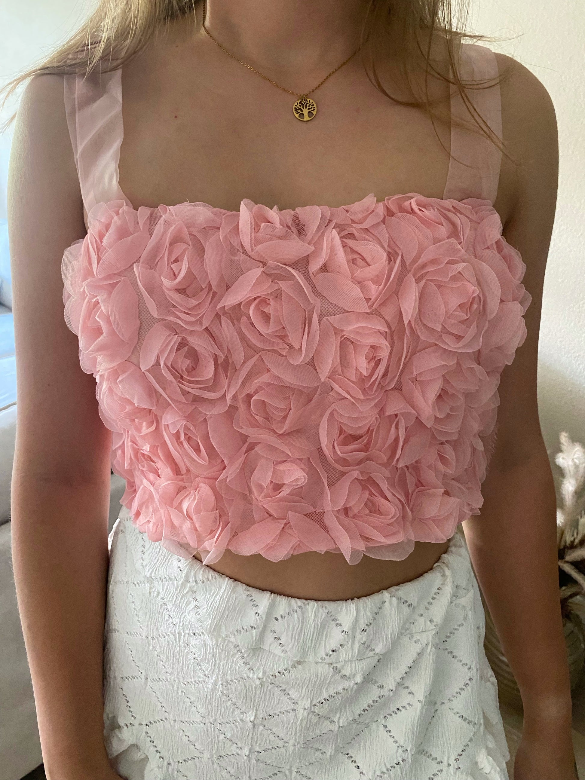 How cute! Deze mooie top heeft rozen, strikjes op de schouders en een ritssluiting aan de achterkant